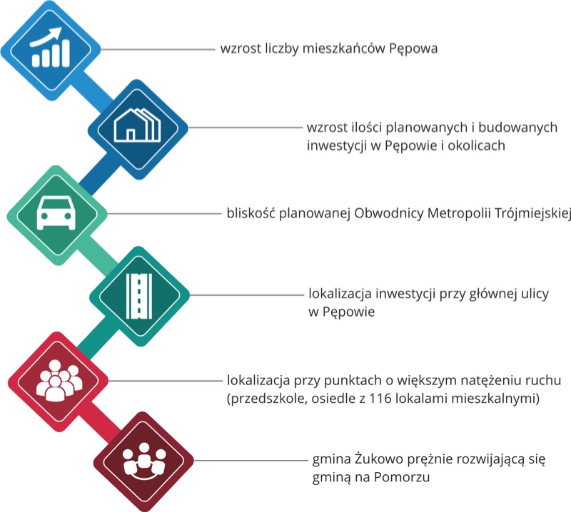 Ze względu na dynamiczny przyrost mieszkańców Pępowa w ostatnich latach oraz na wciąż powstające w najbliższej okolicy nowe domy wolnostojące i budynki mieszkalne, inwestycja w lokal usługowy na os. Gdańskim jest gwarancją sukcesu prowadzonego biznesu.